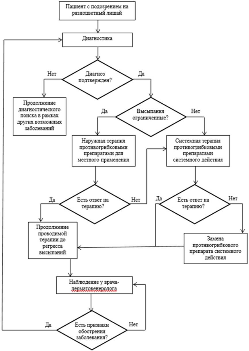 Пациентам с разноцветным лишаем назначается наружное лечение противогрибковыми препаратами для местного применения. Их использование следует считать предпочтительным при ограниченном поражение кожи. В случае поражения волосистой части головы удобно использование шампуня кетоконазола. При распространенном поражении кожи или неэффективности наружной терапии может назначаться системная терапия противогрибковыми препаратами системного действия [2, 10]. Обязательным условием назначения системной терапии является обнаружение возбудителя при микроскопическом исследовании. При отсутствии эффекта от лечения проводится замена противогрибкового препарата системного действия.