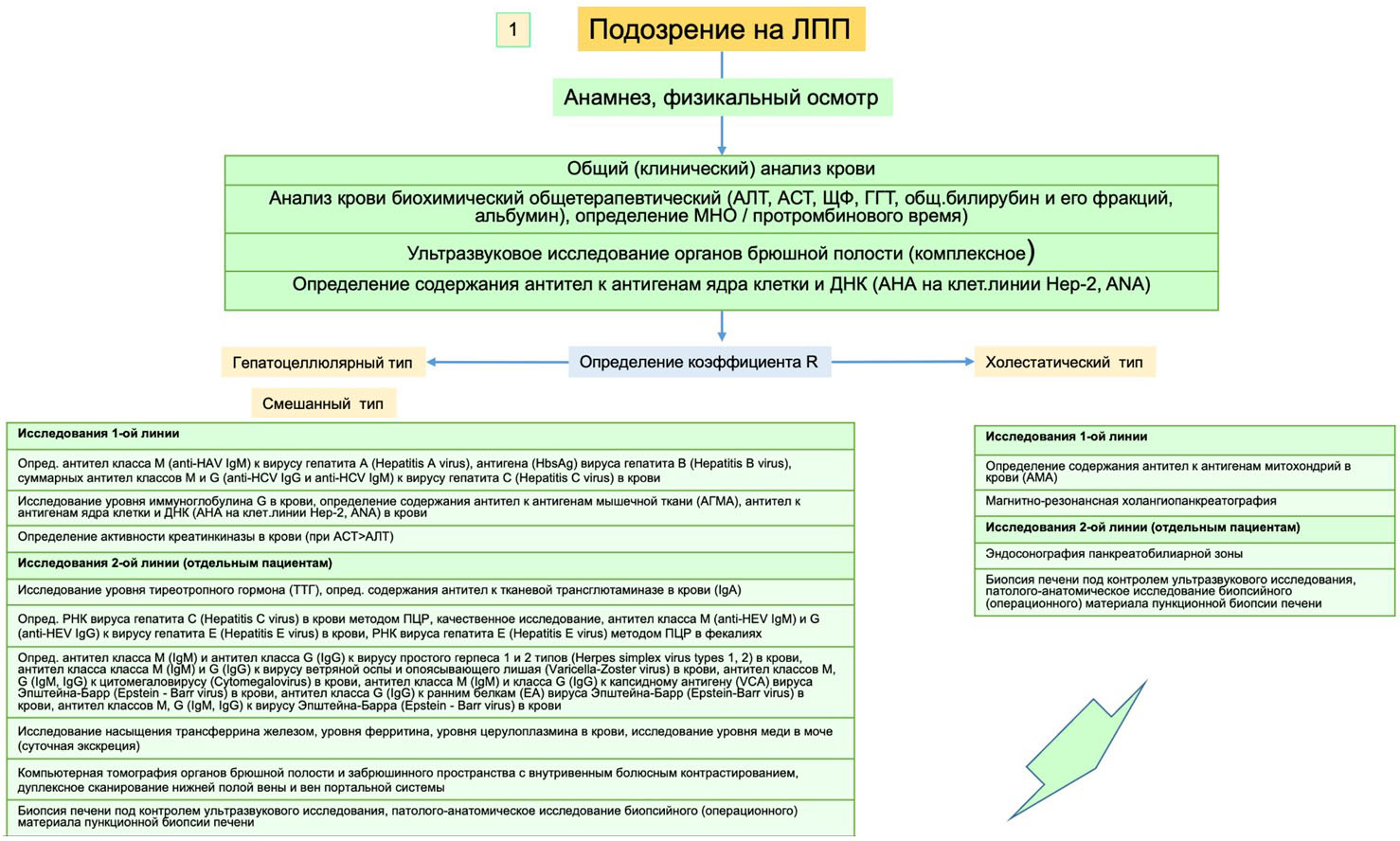 2 классифицирует холестатический тип поражения печени, а значение R > 2 < 5 отражает смешанный тип ЛПП.