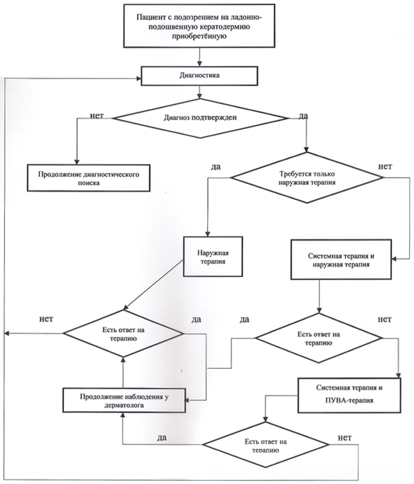 Для лечения пациентов с первичными и идиопатическими ЛПКП используется наружная и системная лекарственная терапия, а также фототерапия. Выбор терапии больных ЛПКП определяется тяжестью клинических проявлений дерматоза и субъективных ощущений (зуда), осуществляется симптоматически, и может изменяться в случае ее недостаточной эффективности. Терапия должна быть направлена на разрешение/уменьшение выраженности высыпаний: на купирование воспаления, гиперкератоза, шелушения, склонности к экссудации, на эпителизацию трещин, субъективных ощущений. Для достижения успешного результата терапии необходима диагностика и лечение возможной основной этиологической причины ЛПКП и коморбидного фона с применением поэтапного междисциплинарного подхода. Паранеопластические кератодермии обычно рефрактерны к местному лечению и могут дать ответ только при успешном лечении основного новообразования.