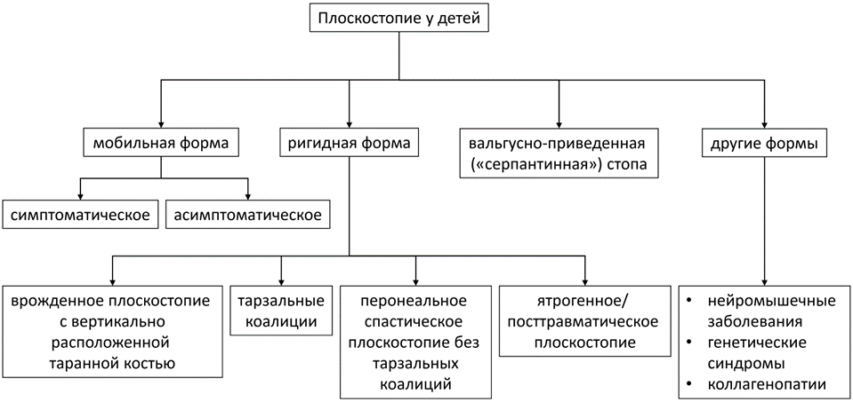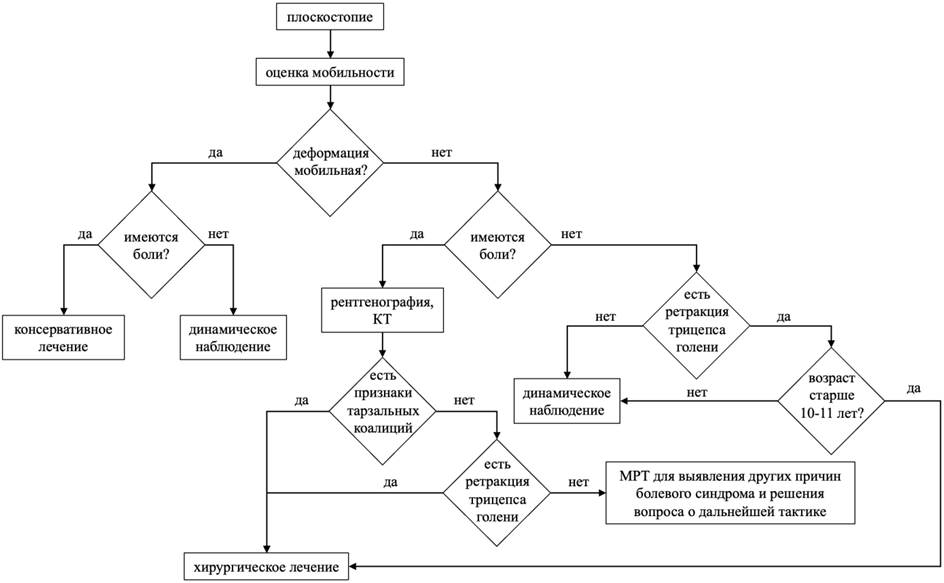 Комментарий: плоскостопие в детском возрасте может сочетаться с наследственными, нейромышечными и другими заболеваниями (синдром Элерса-Данло, синдром Марфана, синдром Дауна, церебральные параличи, миодистрофии и другие). При подозрении на наличие сопутствующей патологии необходимо продолжить диагностический поиск для выявления других заболеваний, требующих коррекции тактики ведения.