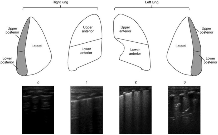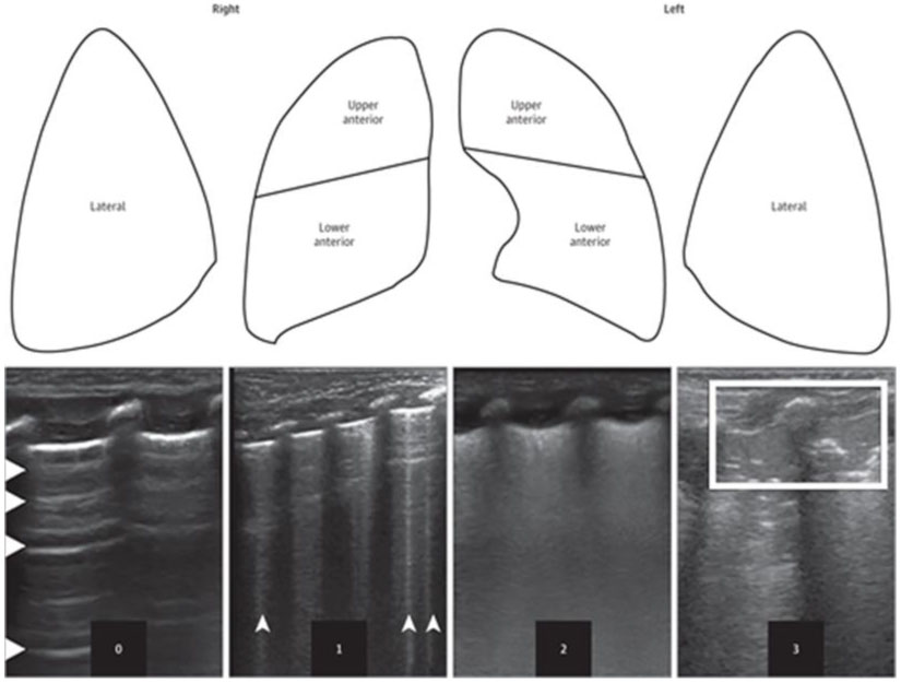 Для каждой из указанных зон исследования проводится оценка ультразвуковой картины легкого в баллах от 0 до 3.