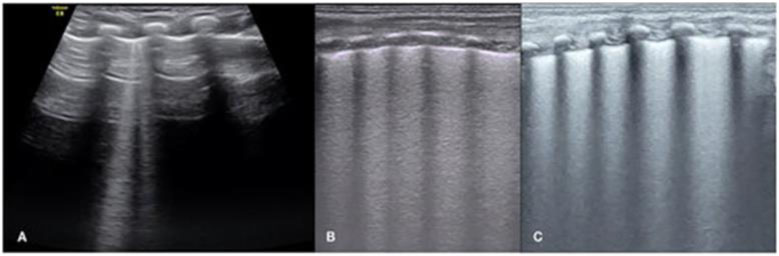 Рис 1. Идентификация линий GOS и B. Видно, что эхогенность линии B (A) и сливающейся линии B (B) в дальнем поле легкого существенно не снизилась, в то время как эхогенность линии GOS (C) значительно ослабла в дальнем поле.