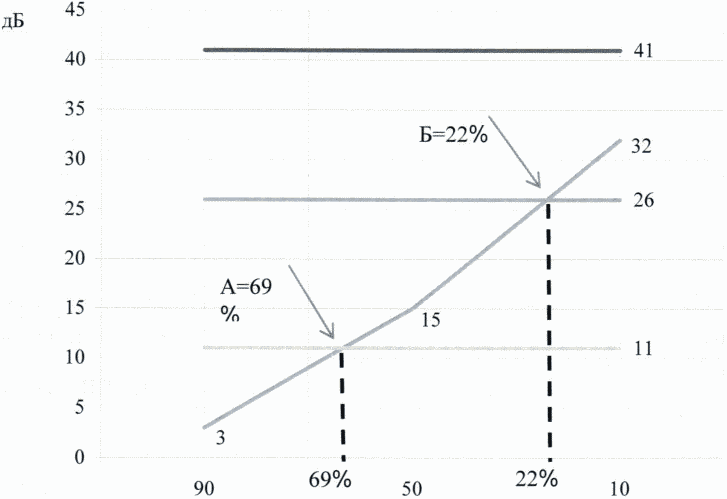 Точка пересечения графика с граничным порогом слышимости 41 дБ соответствует вероятности развития НСТ II степени.
