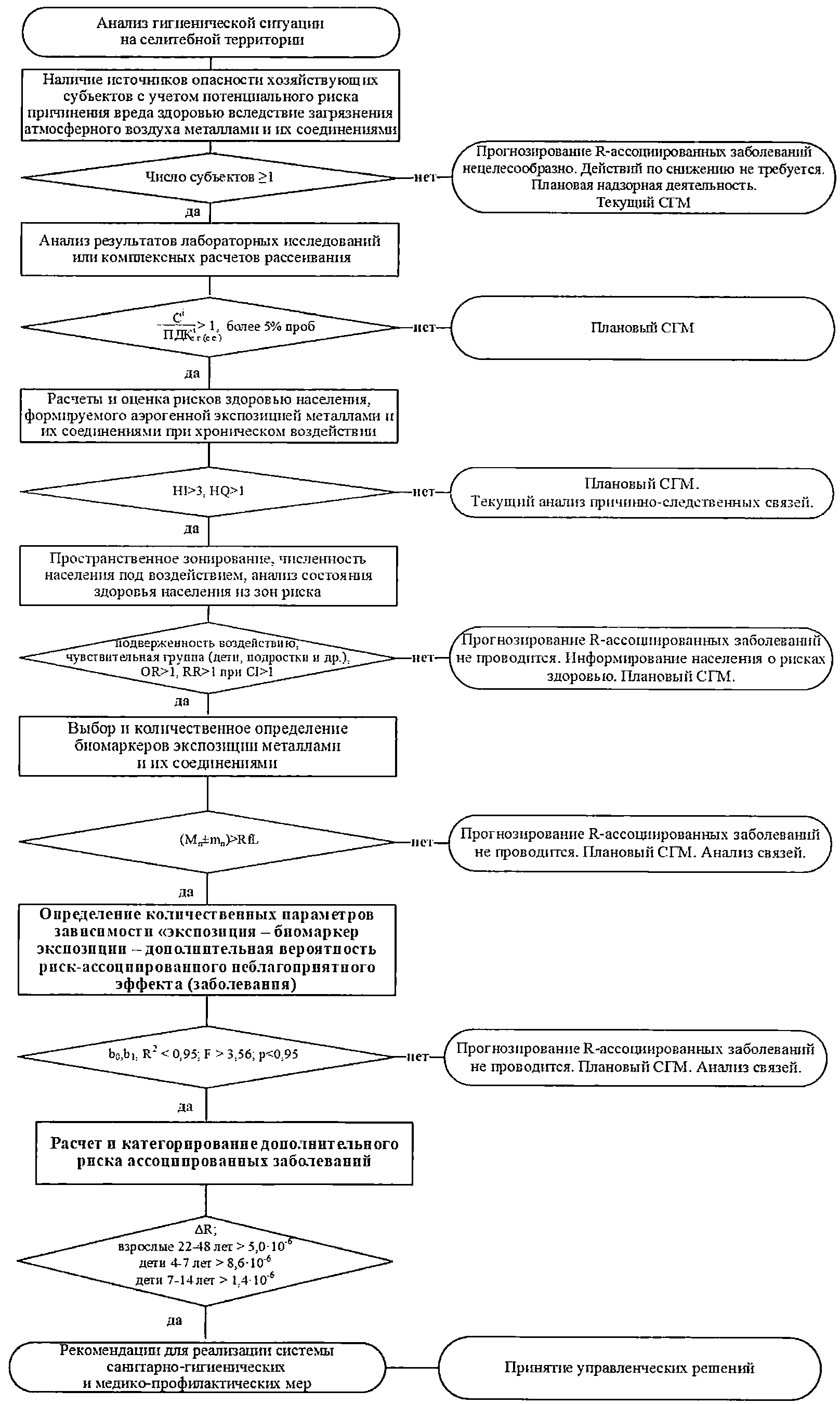 3.2. Прогнозирование риск-ассоциированных неблагоприятных эффектов (заболеваний) (далее - риск-ассоциированных заболеваний или R-ассоциированных заболеваний) вследствие нарушений обязательных требований к содержанию металлов и их соединений в атмосферном воздухе на основе системы биомаркеров (биомаркеров экспозиции и биомаркеров неблагоприятных эффектов) осуществляется по приведенному ниже адаптивному алгоритму (рисунок):