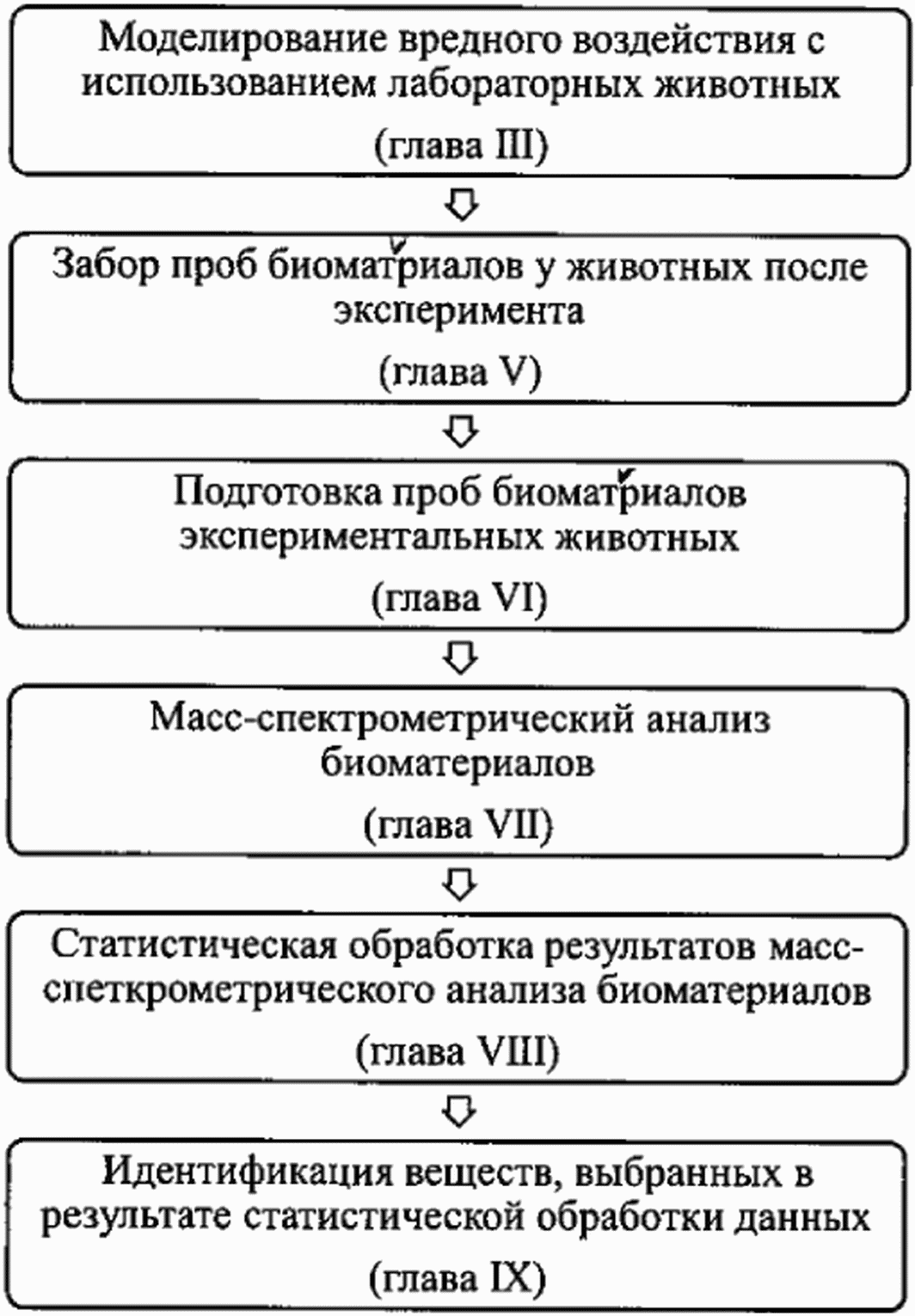 2.4. Алгоритм проведения исследования включает в себя: эксперимент по моделированию вредного воздействия с использованием лабораторных животных, масс-спектрометрический анализ биоматериала с предварительным жидкостно-хроматографическим разделением (далее - УВЭЖХ-МС), статистическую обработку результатов анализа с целью выявления изменений содержания веществ с последующей их идентификацией. В результате получают ряд метаболитов, изменение содержания которых в организме лабораторных животных связано с воздействием изучаемого вредного фактора. Общая схема проведения исследования приведена на рис. 1. Схема алгоритма проведения подготовки, жидкостного хроматомасс-спектрометрического анализа и первичной обработки результатов анализа проб биоматериала экспериментальных животных представлена в приложении 1 к настоящим МР. Схема алгоритма проведения статистической обработки результатов анализа проб биоматериалов экспериментальных животных представлена в приложении 2 к настоящим МР.