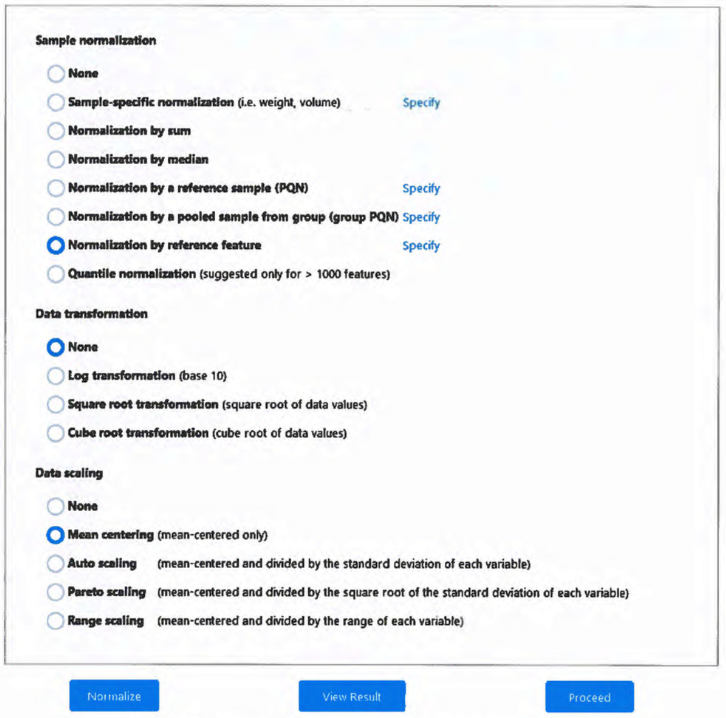 5.7. Нормализация сигналов веществ в РП проводят с использованием вещества-стандарта. Для этого в окне "Нормализация проб" (англ. Sample normalization) выбирают пункт "Нормализация по референсному сигналу" (англ. Normalisation by reference feature) и в выпадающем списке отмечают сигнал, соответствующий ВС (рис. П5.7).