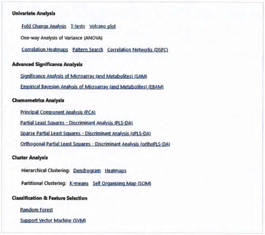 5.8. В окне "Статистические методы" (англ. Statistics) представлены методы получения информации о сигналах, величины которых значимо отличаются в экспериментальных группах (рис. П5.8).