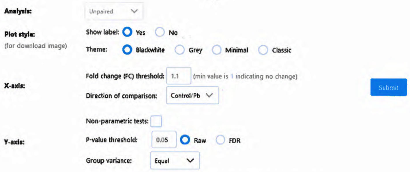 5.9. Классический статистический анализ представлен в виде "вулканообразной" диаграммы (англ. Volcano plot, далее - Volcano plot), учитывающим статистическую значимость отличий с поправкой на множественные сравнения или без (пункты "Коррекция с учетом оценкой ложноположительных результатов" (англ. false discovery rate, FDR) и "Данные без обработки" (англ. Raw), соответственно) и кратность изменения сигнала (англ. Fold change) (рис. П5.9). Пороговые значения данных параметров задают в соответствующих полях. По умолчанию, для проведения межгрупповых сравнений используется t-критерий Стьюдента (использование U-критерия Манна-Уитни выбирают отметкой пункта "Непараметрический критерий" (англ. Non-parametric tests). Результат анализа выгружают в виде изображения или таблицы формата Excel, содержащей m/z выбранных веществ, время удержания, p-значение и кратность изменения сигнала (рис. П5.10).