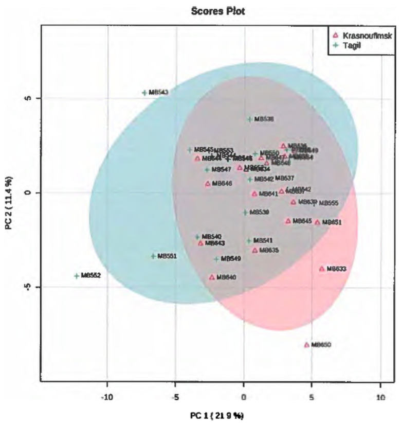 5.10. Многомерный статистический анализ данных результатов измерений РП выполняют методами главных компонент, который проецирует значения сигналов всех веществ от всех проб на двухкоординатную плоскость, уменьшая таким образом размерность данных и демонстрируя тенденцию в изменении сигналов между двумя экспериментальными группами и их выбросы (рис. П5.11).