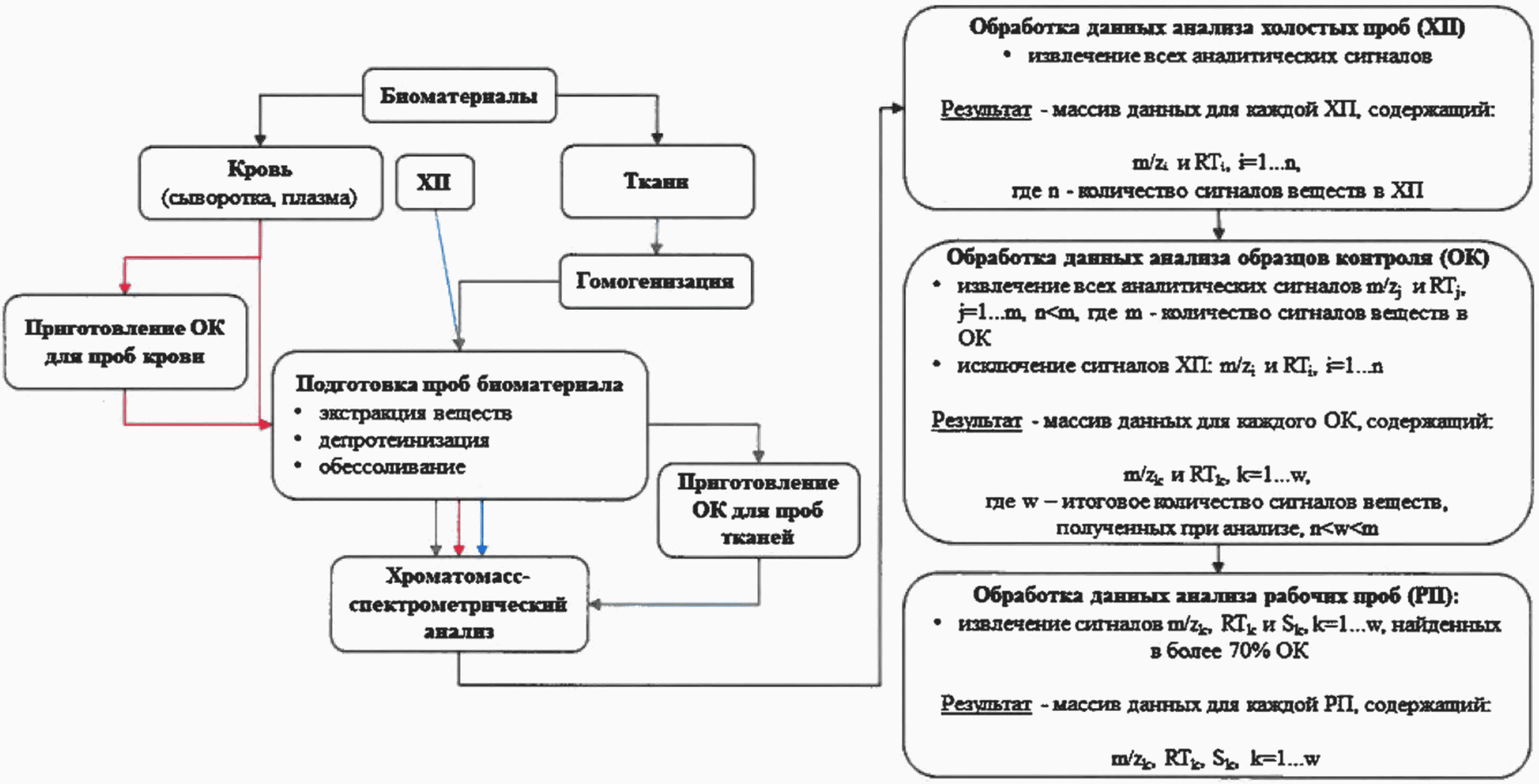 <11> Примечание: ХП - холостая проба; ОК - образец контроля; РП - рабочая проба; m/z - массово-зарядовое число аналитического сигнала вещества; RT - время удерживания вещества на хроматографической колонке; Sk - площадь пика сигнала вещества; -> - алгоритм подготовки проб крови; -> - алгоритм подготовки проб тканей; -> - алгоритм подготовки холостых проб.