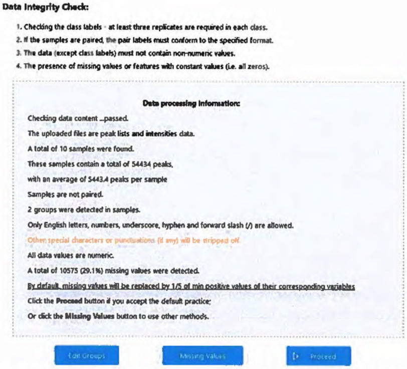 5.4. В появившемся окне задают точность определения времени удержания в секундах и m/z. После подтверждения параметров выравнивания, система отобразит информацию о количестве загруженных файлов (англ. Data integrity check), содержащих результаты анализа проб аналитических сигналов веществ, о количестве экспериментальных групп и пропущенных значениях (рис. П5.4).