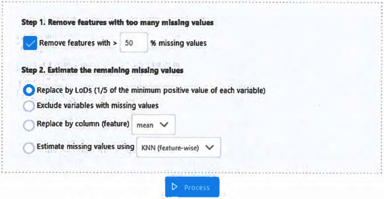 5.5. Для выполнения импутации пропущенных значений переходят во вкладку "Пропущенные значения" (англ. Missing Values). Данный процесс в результатах анализа проб проводят посредством присвоения значения сигнала, соответствующего теоретическому пределу обнаружения вещества. Из обработки исключают вещества, имеющие более половины пропущенных значений аналитического сигнала среди всех проб (рис. П5.5).