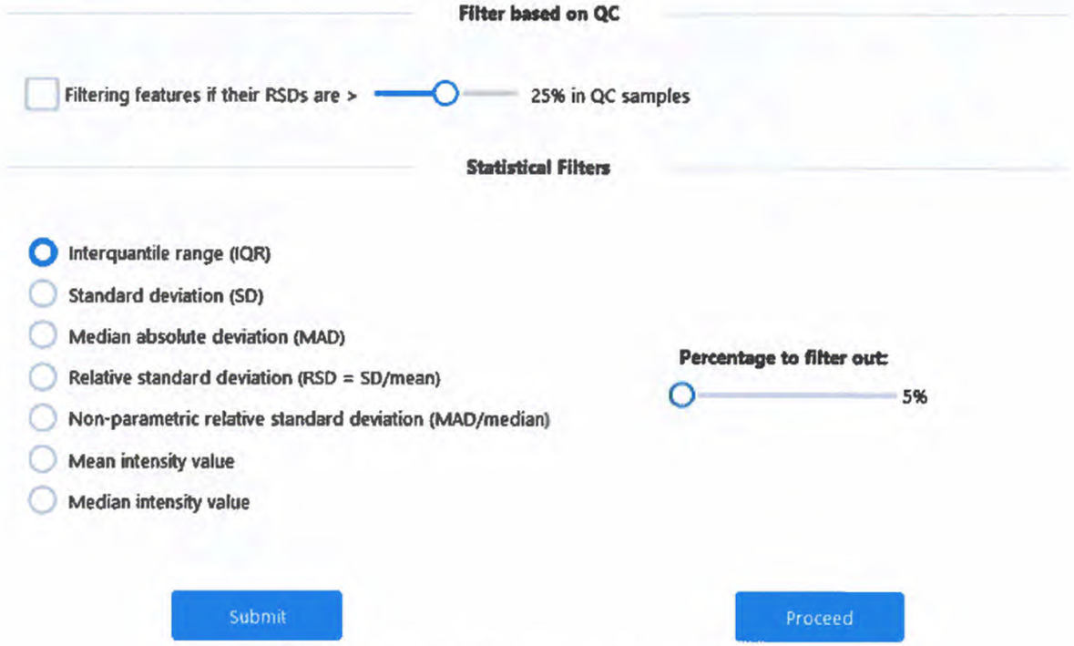 5.6. Удаление неинформативных значений аналитических сигналов проводят посредством оценки стандартного отклонения или межквартильного размаха величины сигнала фильтры "Стандартное отклонение" (англ. Standard deviation) и "Межквартильный размах" (англ. Interquartile range), соответственно, и по среднему или медиане значений сигнала фильтры "Среднее значение интенсивности" (англ. Mean intensity value) и "Медианное значение интенсивности" (англ. Median intensity value), соответственно (рис. П5.6). В окне "Статистические фильтры" (англ. Statistical filters) необходимо выбрать соответствующий фильтр, и применить его нажатием кнопки "Подтвердить" (англ. Submit) после каждого выбранного фильтра, т.к. их действие является аддитивным. По окончании отбора данных переходят к этапу нормализации нажатием кнопки "Продолжить" (англ. Proceed).