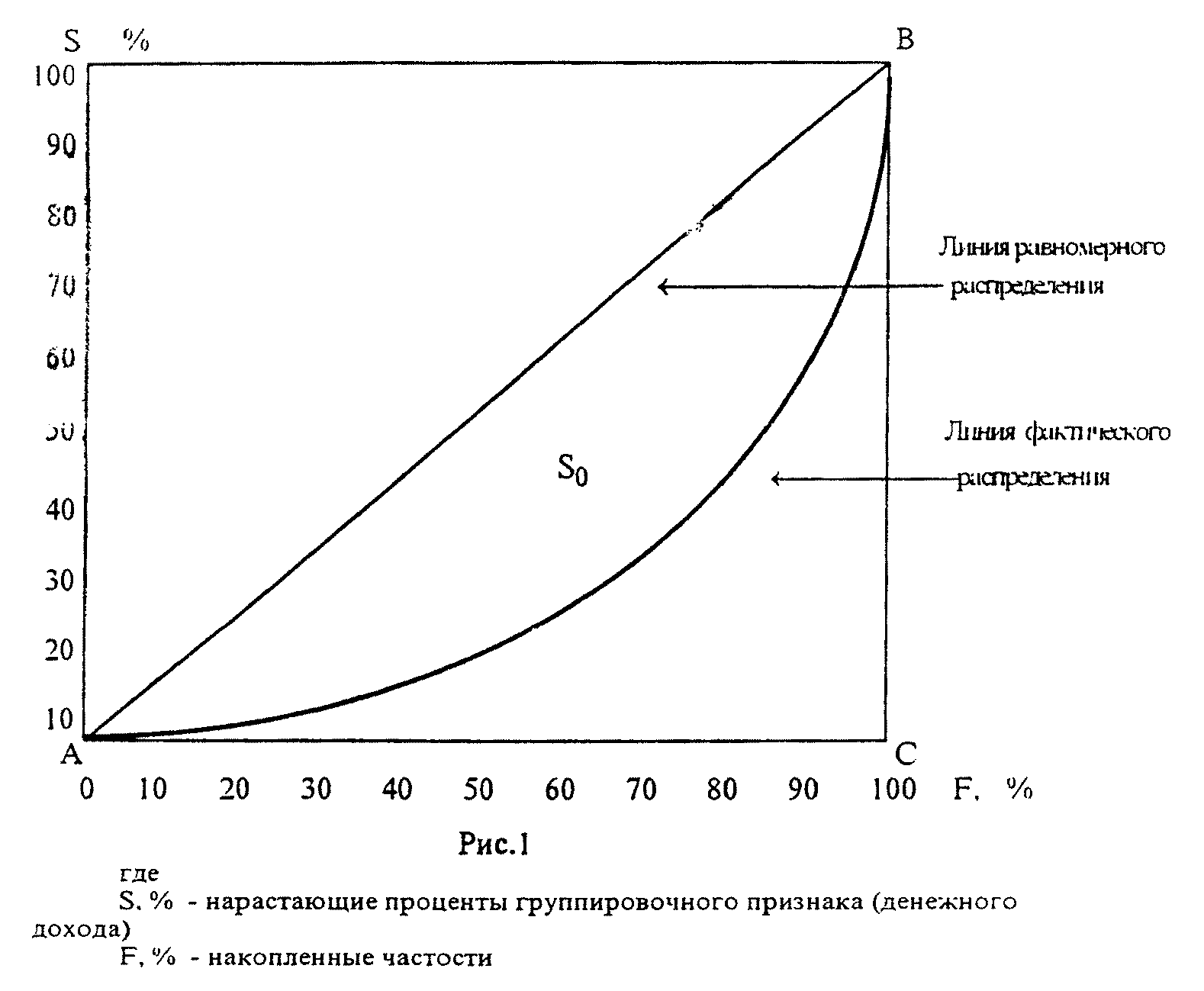 КОЭФФИЦИЕНТ КОНЦЕНТРАЦИИ ДОХОДОВ (ИНДЕКС ДЖИНИ): устанавливает степень отклонения фактического объема распределения доходов населения от линии их равномерного распределения.