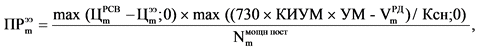 2. Цена на мощность, продаваемую по договорам купли-продажи (поставки) мощности (), рассчитывается коммерческим оператором оптового рынка для генерирующего объекта по итогам каждого месяца m периода поставки мощности по договорам купли-продажи (поставки) мощности, но не ранее месяца, в котором определенный системным оператором предельный объем поставки мощности генерирующего объекта впервые был больше нуля, и определяется по формуле (рублей/МВт):