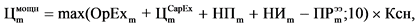 OpExm - значение удельных затрат на эксплуатацию генерирующего объекта, равное цене на мощность, определенной для ценовой зоны, в которой расположен генерирующий объект, по итогам конкурентного отбора мощности, для соответствующего года поставки, уменьшенное на коэффициент 1,2, а также уменьшенное в 2026 - 2030 годах на коэффициент 1,0341 (рублей/МВт в месяц);