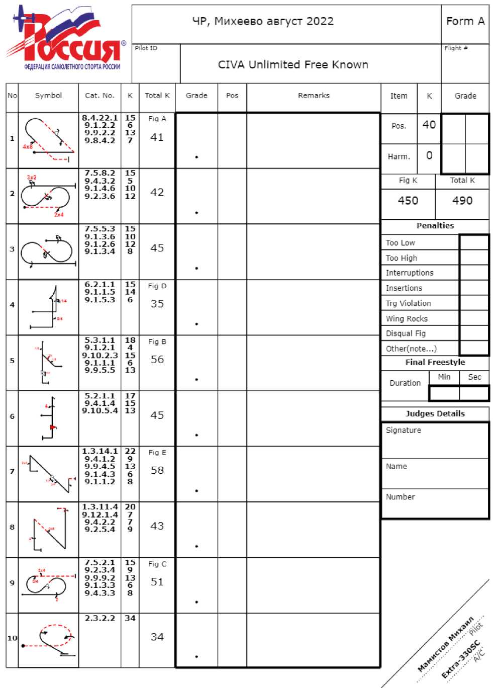После выполнения комплекса пометки в колонке "Pos" (позиция) используются каждым судьей для определения снижения оценки за место пилотажа на основании записанных наблюдений. Каждая одиночная буква принимается за эквивалент 0,5 баллов, каждая двойная буква - за эквивалент 1 балла снижения оценки за место пилотажа. Например, пометки L, R, N, FF, LL и R приведут к снижению оценки на 4 балла. Судья может изменить окончательную оценку за место пилотажа максимум на 1 балл, если считает, что были другие значимые факторы, которые должны быть приняты во внимание для уменьшения или увеличения снижения оценки.