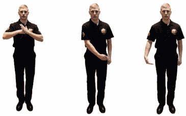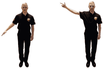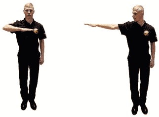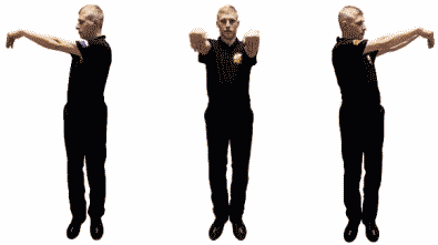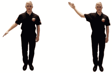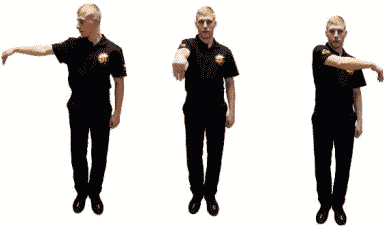 Действие следует за 3 предупреждением. Согнуть руку перед собой на уровне грудной клетки и отвести прямую руку в сторону