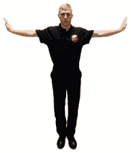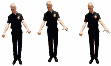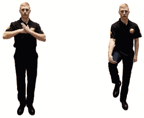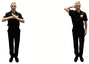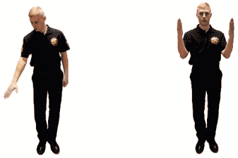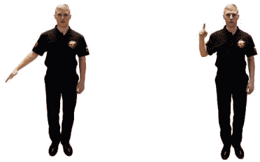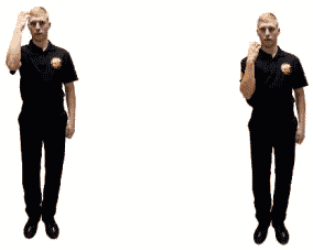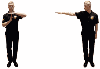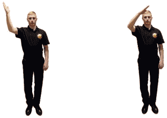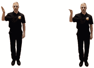 Отвести правую руку ладонью вниз с последующей командой голосом: "СТОП, В СТОЙКУ" и поднять двери руки вертикально перед собой ладонями во внутрь