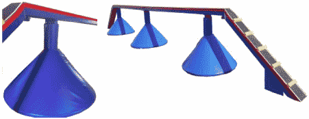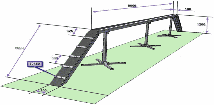 1) производят нагружение лестницы путем подвески грузов массой 100 кг по одному в середине каждого колена, с помощью скоб, размещенных на ступенях вплотную к тетивам шириной от 80 до 100 мм. Общая масса грузов 300 кг.
