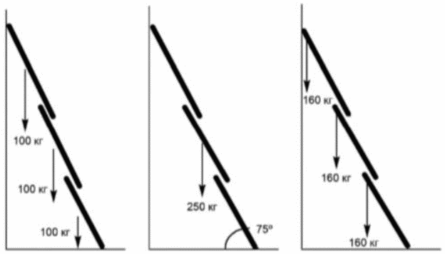 2) производят нагружение лестницы путем подвески грузов массой 250 кг в середине среднего колена лестницы с помощью скоб, размещенных на ступенях вплотную к тетивам.