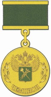 Нагрудный знак "Чемпион" (далее - нагрудный знак) имеет форму золотистого круга диаметром 25 мм, с выпуклыми бортиками с обеих сторон. На лицевой стороне нагрудного знака расположено рельефное изображение эмблемы ФТС России, помещенное между двумя лавровыми ветвями. Щит в эмблеме ФТС России покрыт зеленой эмалью. Под эмблемой ФТС России прямыми выпуклыми литерами расположена полукругом надпись "ЧЕМПИОН". На оборотной стороне нагрудного знака прямыми выпуклыми литерами в две строки расположена надпись "ФТС//РОССИИ".