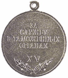 На оборотной стороне медали выпуклыми литерами в четыре строки расположена надпись "ЗА//СЛУЖБУ//В ТАМОЖЕННЫХ//ОРГАНАХ". Под надписью размещены римские цифры, определяющие количество лет службы: I степени - XX, II степени - XV, III степени - X. В нижней части оборотной стороны медали помещены две скрещенные лавровые ветви.