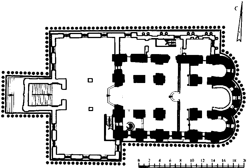пространственно-планировочная структура здания в пределах капитальных стен, столбов, колонн, прямоугольных и арочных проемов, хор и перекрытий XII в., XVII в., XIX в., в том числе отметки разноуровневых полов;