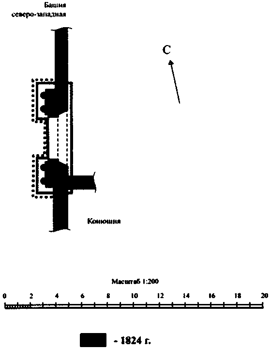местоположение и градостроительные характеристики объекта 1820-х годов в западной части ансамбля Юрьева монастыря, между конюшней и северо-западной башней, его композиционная роль в пространственно-планировочной структуре комплекса;