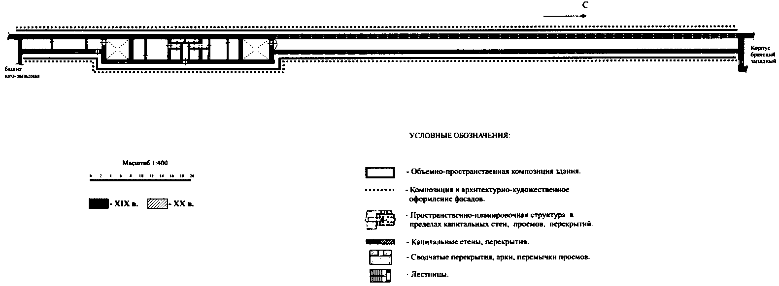 объемно-пространственная композиция, состоящая из двух отрезков крепостной стены с коридором и одноэтажного здания, перекрытого вальмовой кровлей, в том числе высотные отметки по карнизам;