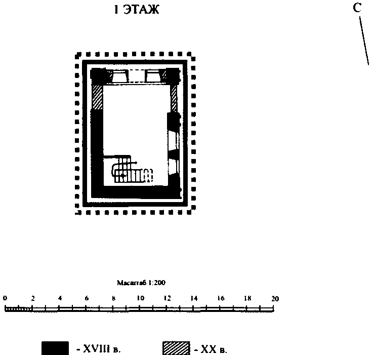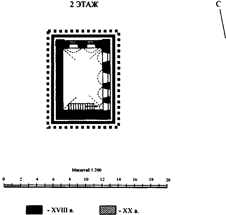 пространственно-планировочная структура здания в пределах капитальных стен, прямоугольных и арочных проемов и перекрытий конца XVIII в.;