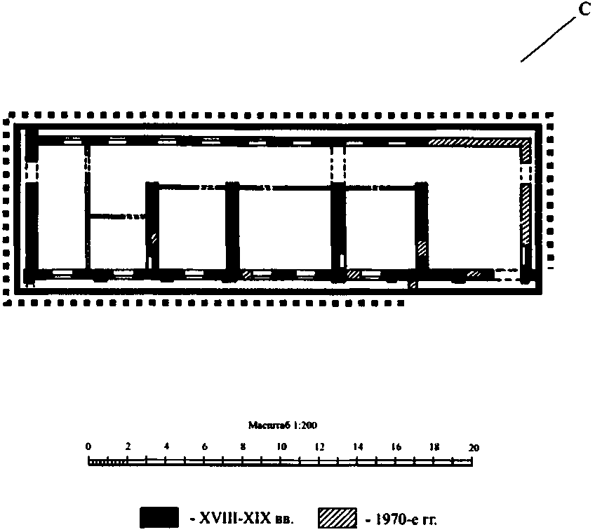 пространственно-планировочная структура здания в пределах капитальных стен, прямоугольных и арочных проемов и перекрытий XVIII в., второй трети XIX в. (с учетом реставрации 1973 - 1975 гг.);