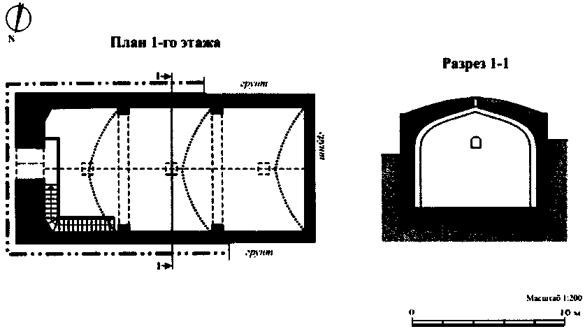 объемно-пространственная композиция прямоугольного полуподземного сооружения со сводчатым перекрытием VI - XVII вв., включая высотные отметки парапета главного фасада;