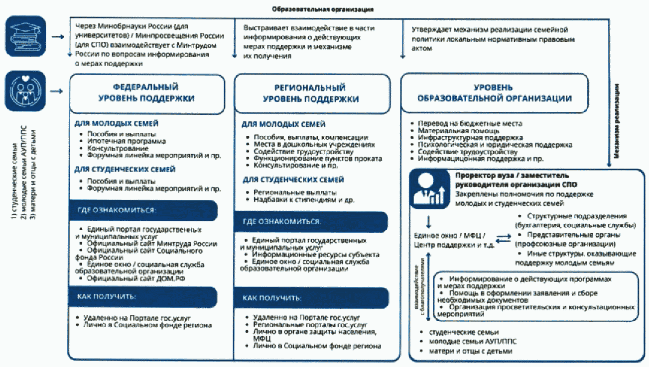 Среди возможных мер поддержки молодых и студенческих семей и обучающихся с детьми, исходя из возможностей образовательной организации, рекомендуется предусмотреть:
