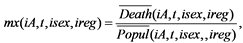 qx(iA,t,isex,ireg) = 5 · mx(iA,t,isex,ireg) / (1 + 2.5 mx(iA,t,isex,ireg)),
