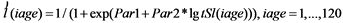 q(iage,par) = 1 / (1 + exp(2 · lgt(iage,par))), iage = 0, ..., 100;