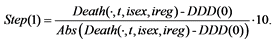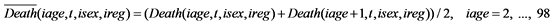 Сравнивается Death(·,t,isex,ireg) и DDD(0). Если абсолютная величина их разности больше 0.5, то