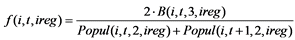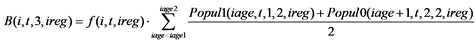 B(i,t,3,ireg) - числа родившихся обоих полов в году t в регионе ireg по возрастным группам матери.