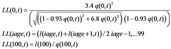 q(iage,t) = exp(2 · lgt(iage,t)) / (1 + exp(2 · lgt(iage,t))), iage = 0, ..., 100;
