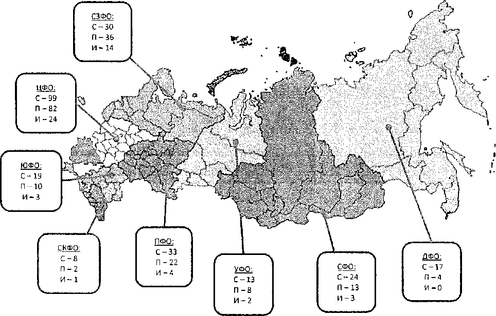 Рис. 1. Распределение саморегулируемых организаций по федеральным округам Российской Федерации (по состоянию на 25 ноября 2025 г.)