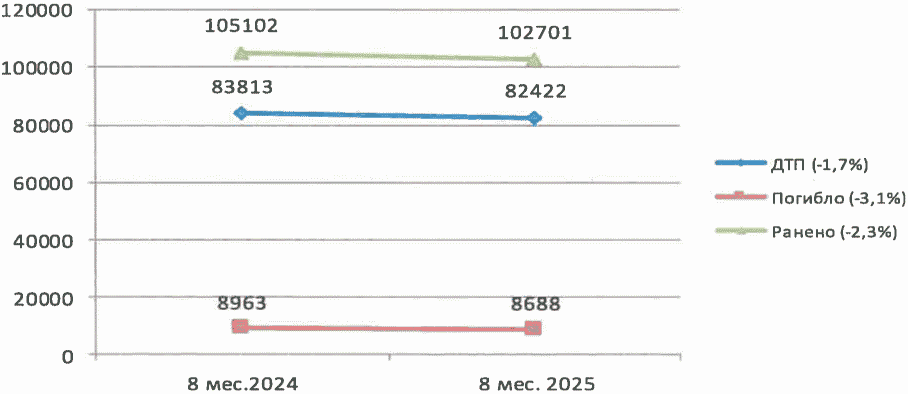 По итогам 8 месяцев <2> 2025 г. <3> на территории Российской Федерации зарегистрировано 82422 ДТП, в которых 8688 человек погибло и 102701 получили ранения.