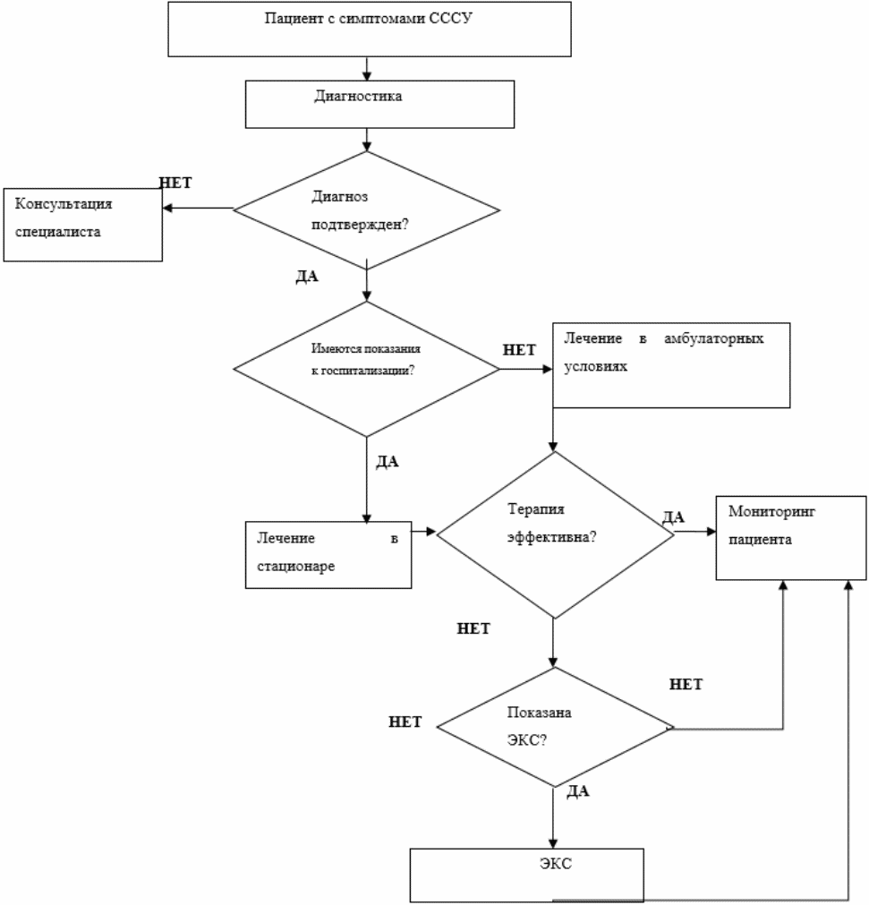 В первых пяти случаях имеет место так называемый, вторичный СССУ, устранение которого находится в прямой зависимости от эффективности терапии основного заболевания. В случаях, когда не удается обнаружить кого-либо заболевания, способного привести к нарушению функции СУ, принято говорить о идиопатическом варианте.